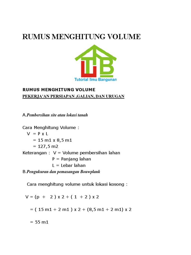 V =pxl = 15 m1 x 8,5 m1 = 127,5 m2 b. V = volume pembersihan lahan p = panjang lahan l = lebar lahan. Pembersihan site atau lokasi tanah cara menghitung volume : Pekerjaan urugan tanah banyak dilakukan dalam pelaksanaan pembangunan infrastruktur seperti jalan raya, perataan taman, bandara. Lalu volumenya bisa dihitung dengan cara luas penampang x panjang pondasi = 0,36m2 x 90m = 32,4m3.